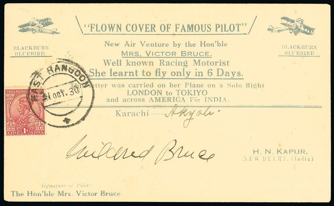 1930 (31 Oct.) Mrs. Victor Bruce flight from London to Tokyo, printed envelope carried on Karachi to Akyab stage, bearing 1a. cancelled at East Rangoon and with East Rangoon Delivery c.d.s. on reverse, signed at foot by Mrs Bruce and scarce as such. Photo