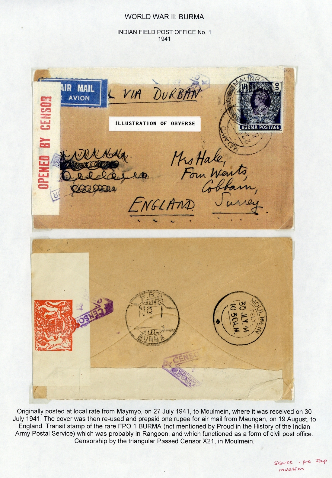 1940-47 collection of c.180 covers starting with 1940 cover from Japan to Rangoon with triangular censor cachet No. 21, 1941 four colour franking from a Mission at Thonze with Mongkok cancels and showing "not opened by censor/10/burma" circular cachet in violet, several pre-Japanese invasion covers and an excellent range of FPOs etc. An excellent lot well worth careful examination and a superb basis upon which to expand