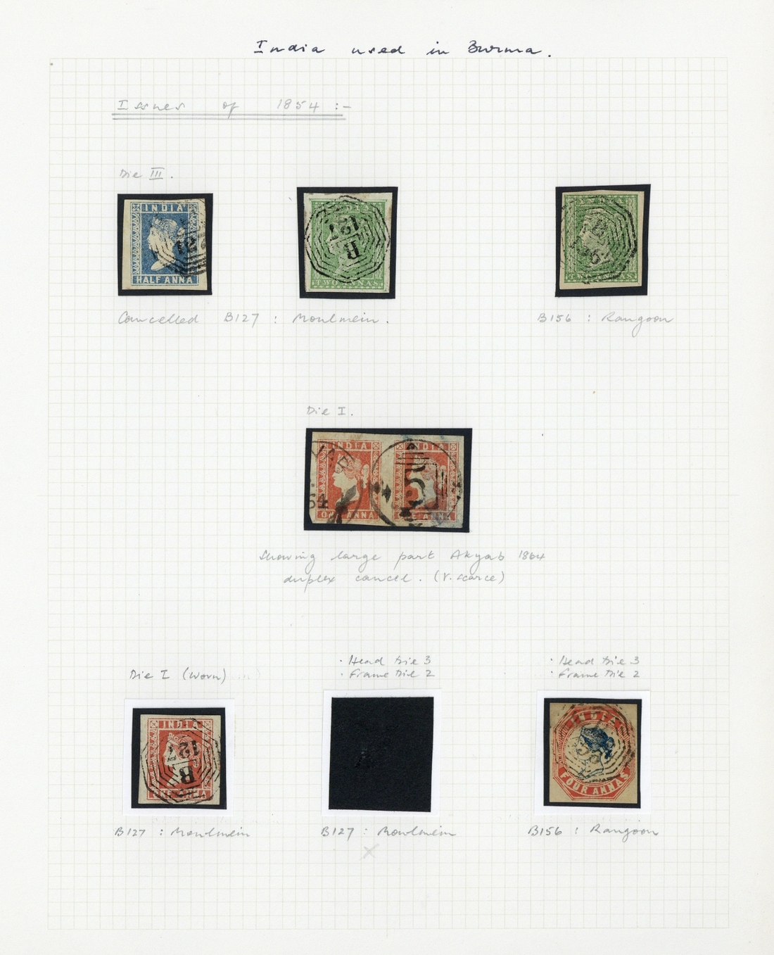 A collection of India used in Burma, housed in a Plymouth album, including 1854 ½a. cancelled "B/127", 1a. pair cancelled by Akyab "5" duplex and a single cancelled "B/172", 2a. (2) cancelled "B/127" and "B156" and 4a. cancelled "B/156", later QV basically complete including 1866 overprinted "postage" 6a., KE to 15r., KGV to 25r. (both), 1937 set overprinted "burma", a good range of Official stamps, scarce Revenues and a study of cancellations including covers (14) and many pieces. A fine lot well worth examination