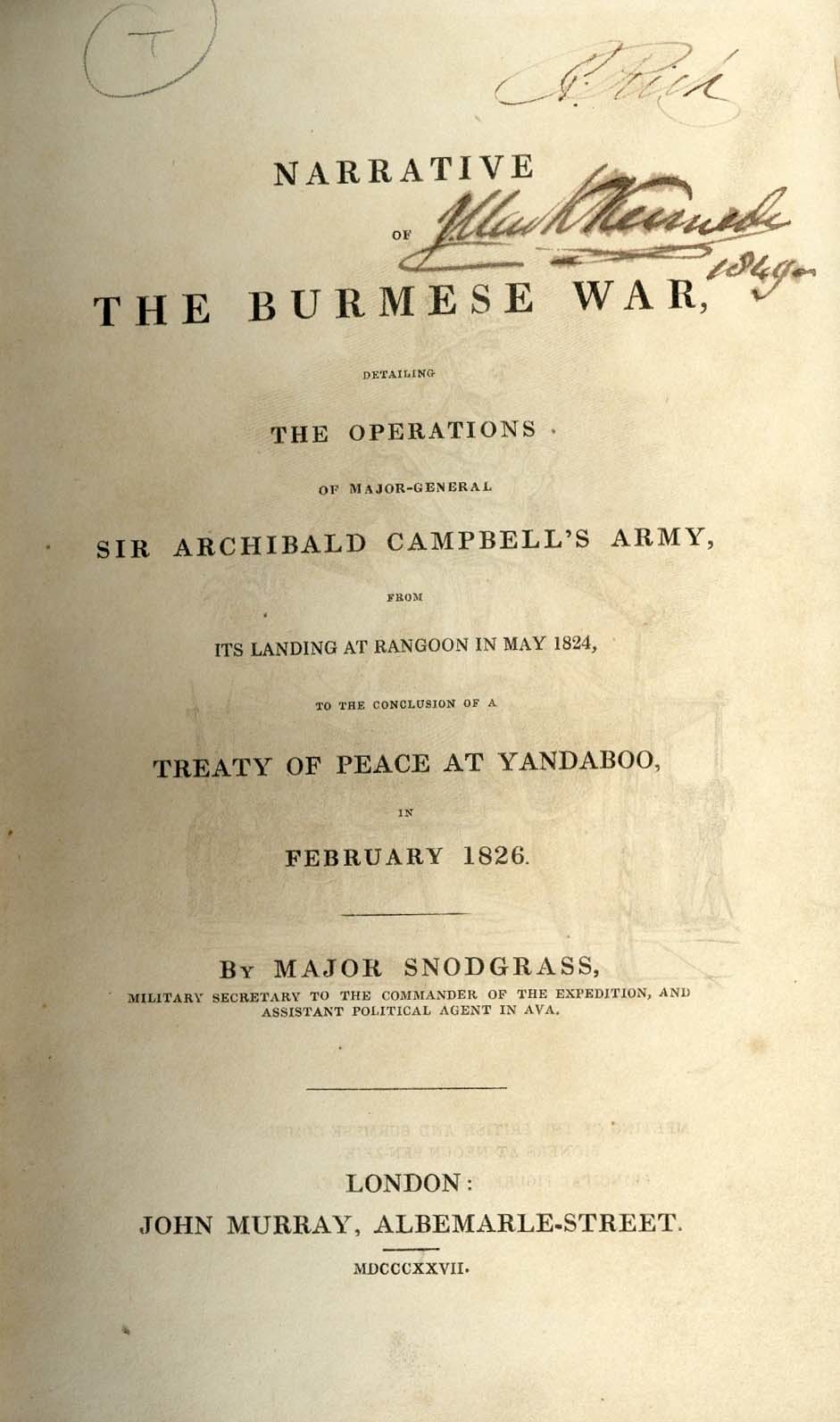 "Narrative of the Burmese War", 1827, by Major J. Snodgrass, military secretary to the commander; re-bound but fine and rare