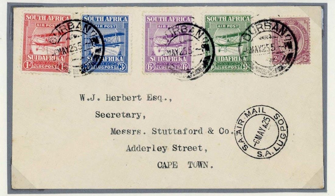 1925 (6 May) envelope from Durban to Cape Town franked by the set of four and 1913 2d., bi-lingual "s.a. air mail/9 may 1925" cachet alongside; fine