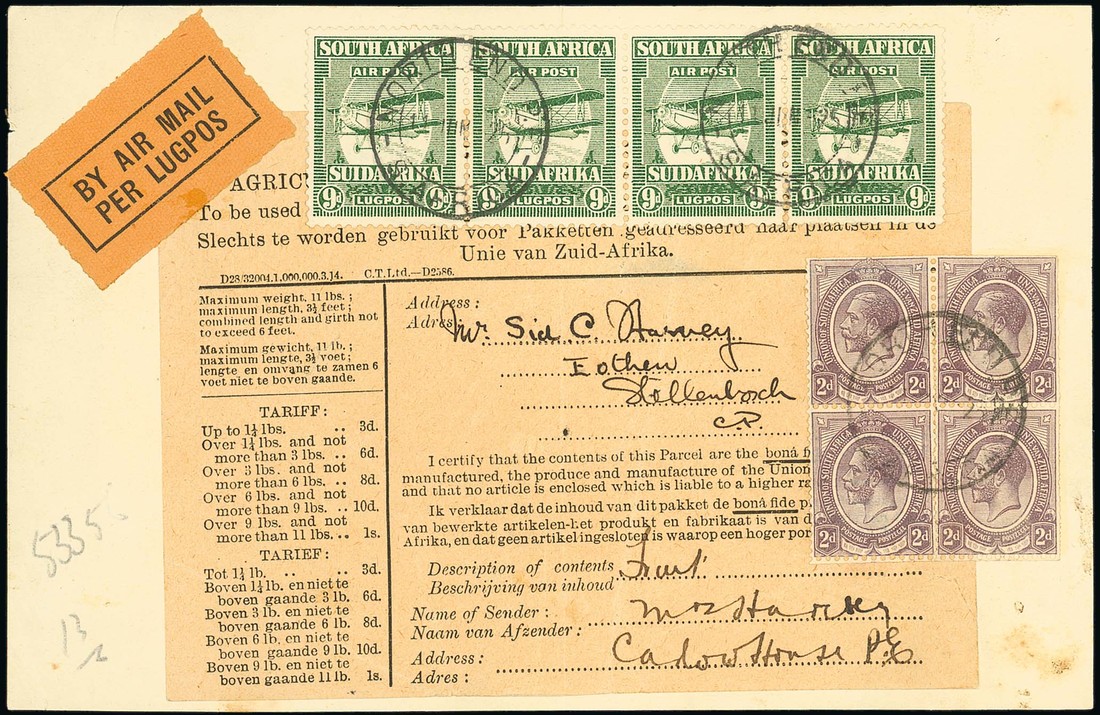 1925 (11 June) piece from a fruit parcel from Port Elizabeth to Cape Town, franked 9d. green horizontal strip of four and 1913 2d. block of four, North End cancellations; crease through one 9d. and tiny traces of staining; otherwise fine and scarce. Photo