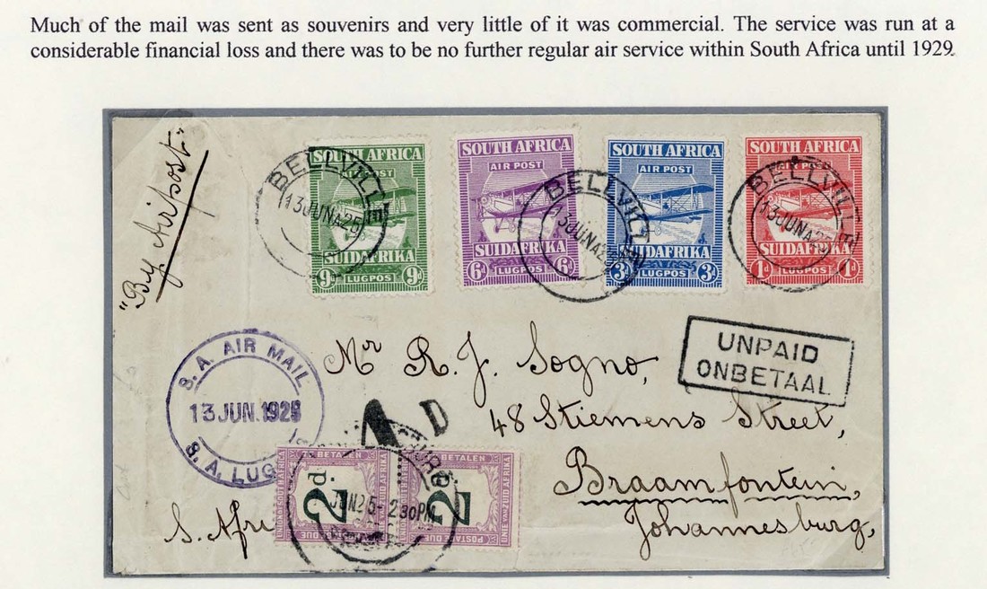 1925 (13 June) envelope to Johannesburg franked by the set of four values only, Bellville cancellations and with bi-lingual "s.a. air mail/13 jun. 1925" cachet, as no postage stamps were applied, marked by a boxed "unpaid" handstamp and taxed by Postage Due 2d. pair on arrival; small perimeter faults and a trifle soiled