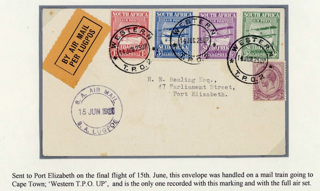 1925 (14 June) envelope to Port Elizabeth franked by the set of four and 1913 2d., Western T.P.O. 2 cancellations and with "s.a. air mail/15 jun. 1925" bi-lingual cachet below; the envelope with a few small stains, vertical crease and the 2d. applied very slightly overlapping the edge