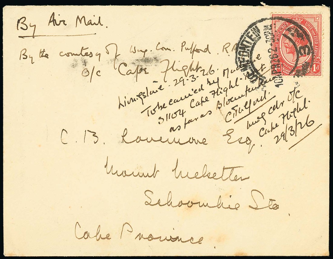 1926 (10 Apr.) first survey flight by the Royal Air Force, envelope to Cape Province, franked 1913 1d. with Bloemfontein cancellation, endorsed "By the courtesy of Wing Com. Pulford R.A.F./O/C Cape Flight" and "Livingstone 29.3.26/To be carried by Machine/S1104 Cape Flight R.A.F./as far as Bloemfontein" and signed "C. Pulford/Wing Cds O/C/Cape Flight/29/3/26"; a few small stain spots, otherwise fine and scarce. Photo