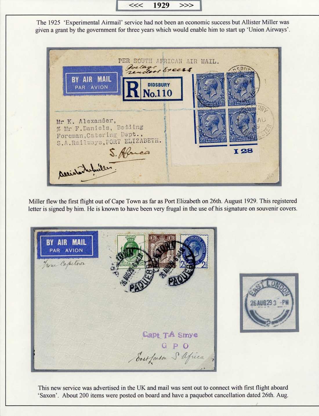 1929 first regular Air Mail Service between Cape Town and Port Elizabeth: 1929 (8 Aug.) souvenir envelope registered from Didsbury to Port Elizabeth franked Great Britain 1924-36 2½d. "I28" control block of four, signed by Allister Miller at lower left, on reverse Port Elizabeth arrival (26.8), also envelope from Cape Town to East London franked Great Britain 1929 P.U.C. ½d., 1½d. and 2½d. with Cape Town cancellations and East London arrival on reverse (both 26.8); scarce