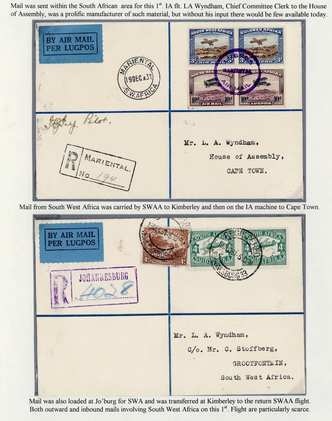1931 (19 Dec.) envelope registered from Mariental to Cape Town, franked South West Africa 1931 Air 3d. and 10d. bi-lingual pairs, also envelope of the same date registered from Johannesburg to Grootfontain franked 4d., Air 4d. pair; fine