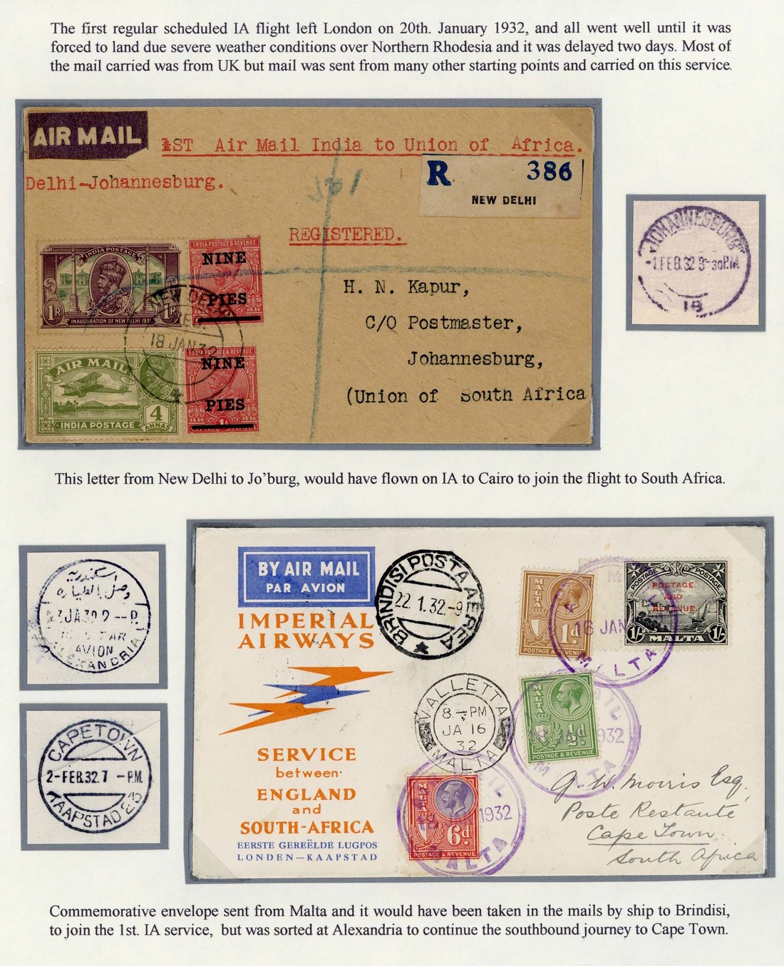 1932 (Jan.) first regular service from London to Cape Town by Imperial Airways, two souvenir envelopes from London to Cape Town and Durban, each franked 1/-, also envelopes or cards from New Delhi to Johannesburg (registered), Valletta, Dodoma, Mbeya, Mpika to Cape Town and Lusaka to Pretoria, good to fine