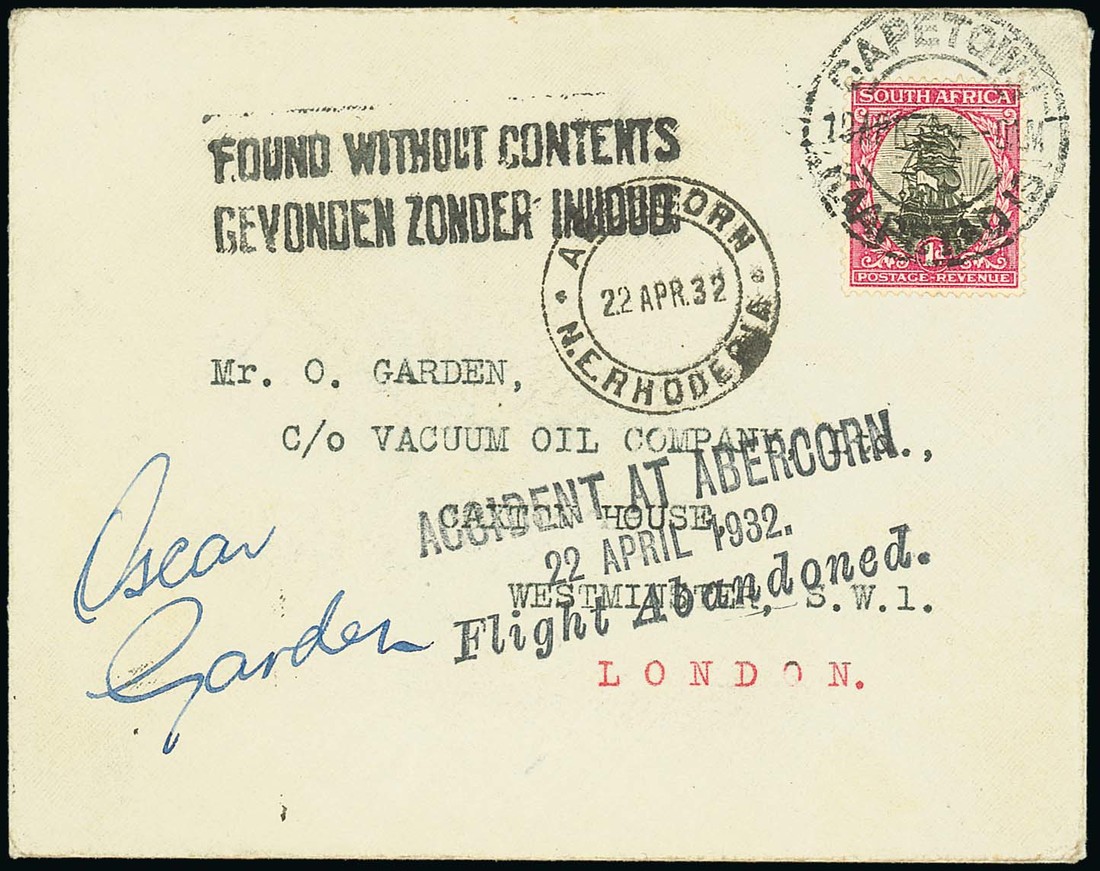1932 (21 Apr.) Oscar Garden attempted Cape Town to London flight, crashed at Abercorn: envelope to London franked Dromedaris 1d. with Cape Town cancellation, Abercorn (22.4) d.s., "accident at abercorn/22 april 1932/Flight Abandoned" and bi-lingual "found without contents" cachets, signed by the pilot; fine and scarce with only twenty covers carried. Photo