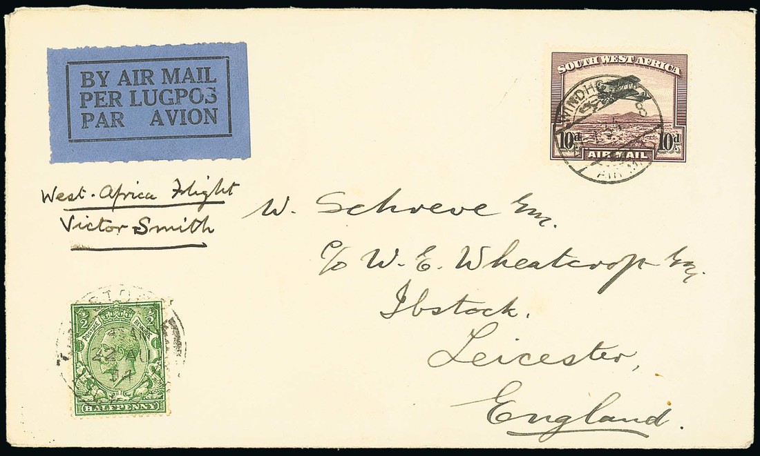 1934 (26 July) Victor Smith attempted flight from Cape Town to London, crashed at Port Etienne, Mauritania: pilot signed envelope to Leicester franked South West Africa Air 10d. with Windhoek cancellation, on arrival in England franked ½d. with Leicester cancellation of 22 Aug.; fine. Only eight pilot signed covers recorded. Photo