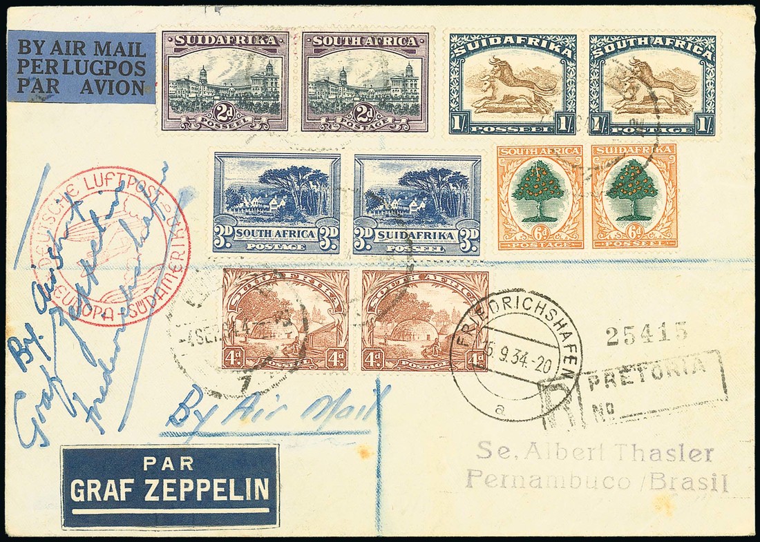 1934 (4 Sept.) envelope registered to Pernambuco franked 2d., 3d., 4d., 6d., 1/- bi-lingual pairs with Pretoria cancellations, Friedrichshafen transit marking (16.9) and carried by the Graf Zeppelin on the 8th. South America flight of 1934, arrival c.d.s. (18.9) on reverse; a few minor stain spots though an extremely rare South African Zeppelin acceptance. It is believed that only two covers are known from South Africa carried on any Zeppelin flight. Photo