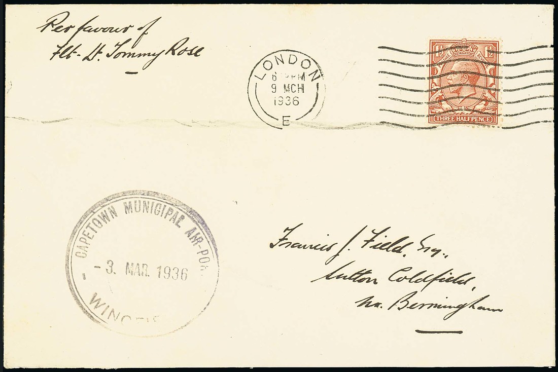 1936 (3 Mar.) South Africa to Great Britain Record Flight by Tommy Rose: cover carried on the return flight with double-ring "capetown municipal air-port/wingfield/-3. mar.1936" cachet, endorsed "Per favour of/Flt Lt. Tommy Rose" on the front, franked Great Britain 1½d. on arrival and cancelled London 9 March 1936, signed by the pilot on reverse; fine and scarce. Photo