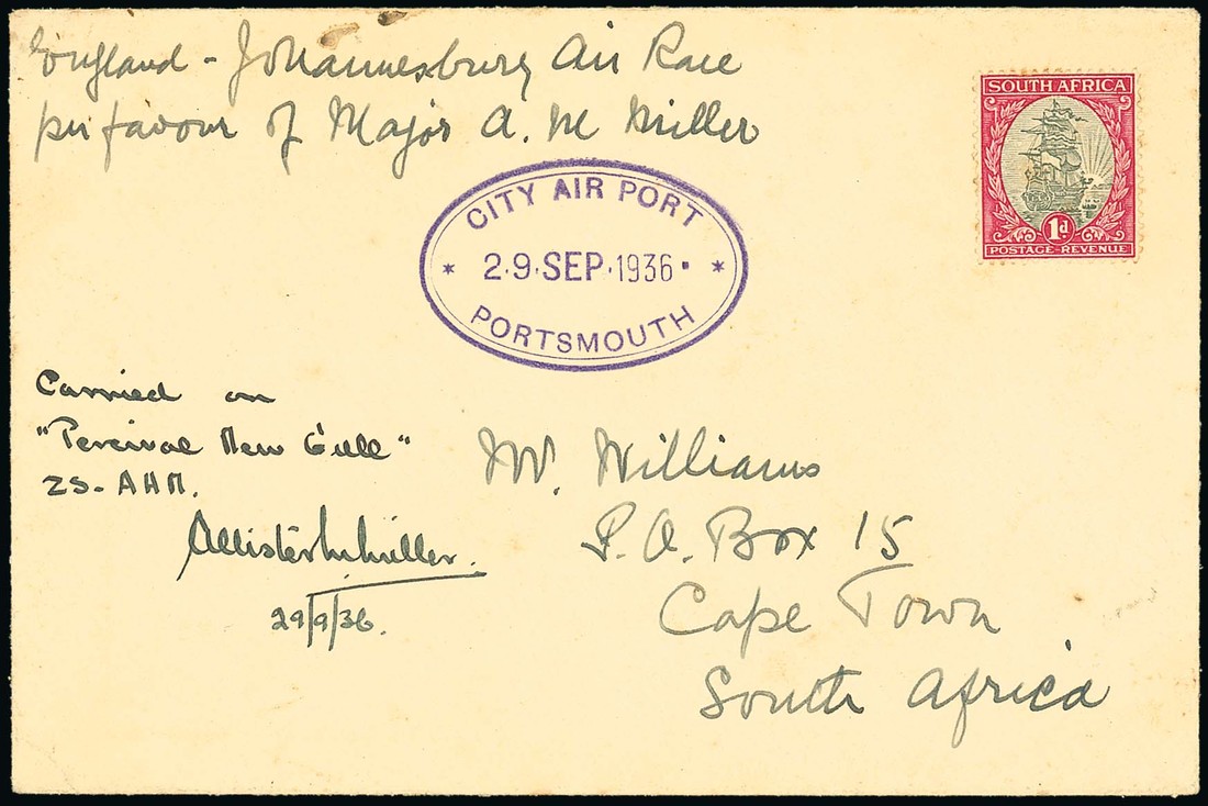 Major A.J. Miller: Envelope to Cape Town, franked 1d. Dromedaris (uncancelled), with violet oval "city air port/*29 sep 1936*/portsmouth" cachet, endorsed "England-Johannesburg Air Race per favour of Major A.J. Miller" and "Carried on "Percival Mew Gull" 2S AHM" signed by the pilot and dated 29/9/36; minor traces of staining, otherwise fine and rare. Only six covers carried. Photo
