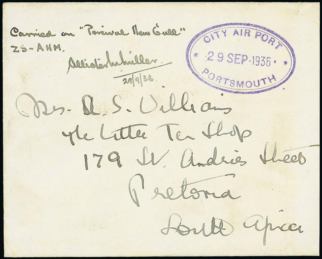 Major A.J. Miller: Stampless envelope, with contents, to Pretoria, violet oval "city air port/*29 sep 1936*/portsmouth" cachet, endorsed "Carried on "Percival Mew Gull"/2S AHM", signed by the pilot and dated 29/9/38; a trifle soiled, otherwise fine and rare. Only six items carried. Photo