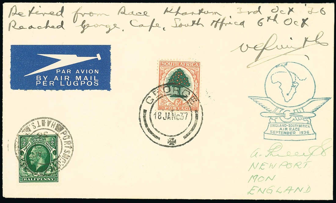 Mr. Victor Smith: Envelope franked G.B. 1934 ½d. with Portsmouth and Southsea cancellation, blue "england-southafrica/air race/september 1936" cachet, endorsed "Retired from Race Khartoum, 3rd. Oct. 36, Reached George, Cape South Africa 6th. Oct." additionally franked Orange Tree 6d. with George cancellation of 18 Jan. 1937; fine. Photo