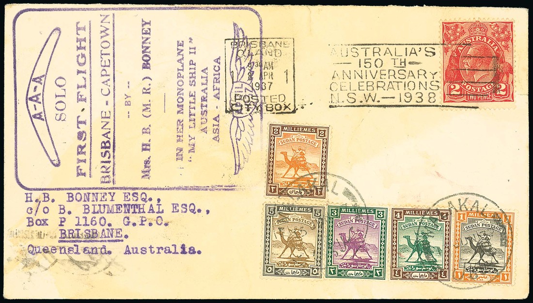 Envelope to Brisbane franked George V 2d. red with Brisbane cancellation, large violet "first flight/brisbane-capetown" cachet, the flight delayed in the Sudan where 1m., 2m., 3m., 4m. and 5m. stamps appled and cancelled "Malakal/13 June 1937", on reverse another strike of the large cachet, White Nile (24.6), Khartoum (27.8) and Brisbane (3.8) datestamps and endorsed "Tail skid damaged" and signed by Mrs. Bonney; a little stained though rare. Photo