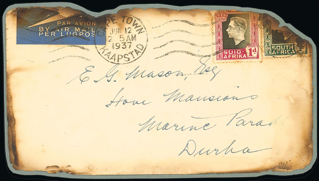 1937 (14 June) Junkers 52 "Earl of Caledon" crashed shortly after take off from Rand airport: charred envelope from Cape Town to Durban franked Coronation ½d., 1d., and with two explanatory slips. Rare. Photo