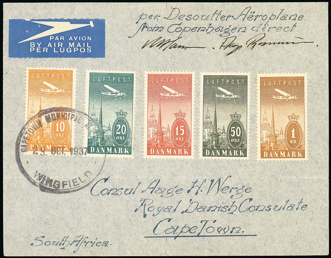 1937 (13 Oct.) Copenhagen to Cape Town flight by Hansen and Rasmussen: envelope franked Denmark 1934 Air uncancelled set, on arrival "capetown municipal airport/wingfield/29. oct. 1937" datestamp cancelling the 10ö and 20ö, signed by the pilots, fine. Twelve covers carried. Photo