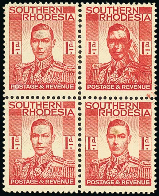 1d. scarlet block of four, the upper right stamp with large "ink smudge" variety, fine unmounted mint; unusual. Photo