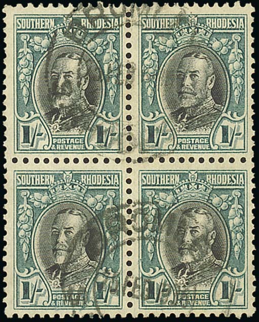 1/- black and greenish blue perf. 11½ block of four, two part Bromley c.d.s.; fine and scarce. S.G. 23a. Photo