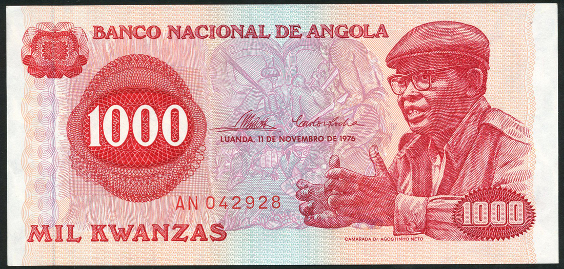 (x) Banco Nacional de Angola, a set of the 11 November 1976 issue comprising 20 kwanzas, orange-brown, 50 kwanzas, mauve, 100 kwanzas, green, 500 kwanzas, blue and 1000 kwanzas, red, all portrait of Antonio Augustinho Neto, the first President, at right, all unknown signature and Lilolwa signatures, reverse various allegorical scenes