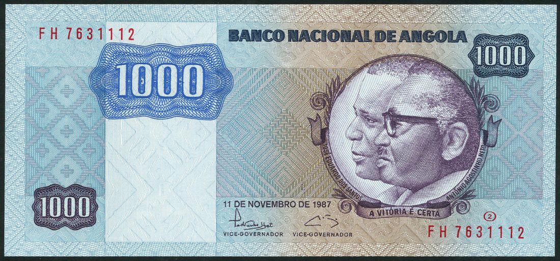 (x) Banco Nacional de Angola, a set of the 1 July 1984 series comprising 50 kwanzas, green, 100 kwanzas, violet and purple, 500 kwanzas, pink-red and 1000 kwanzas, blue, all Antonio Agostinho Neto and Jose Eduardo dos Santos portraits at right, all de Carvalho and Pizarro signatures, reverse allegorical scenes, also a 500 and 1000 kwanzas, 11 November 1987, designs as previous but signatures of Neto and Inacio