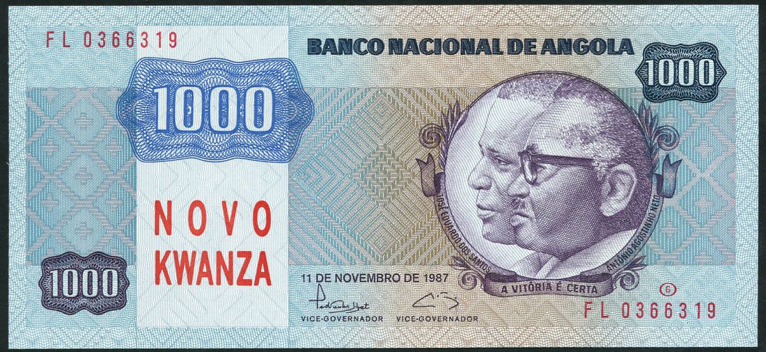(x) Banco Nacional de Angola, 500 novo kwanza, pink-red and 1000 novo kwanza, blue, 11 November 1987, both portraits of Antonio Augustinho Neto and Eduardo dos Santos at right, Neto and Inacio signatures