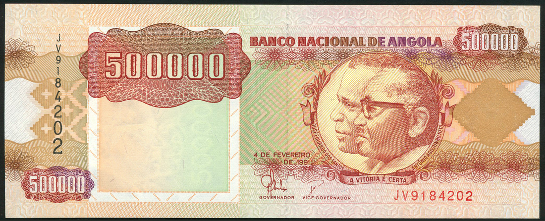 (x) Banco Nacional de Angola, a set of the 4 February 1991 series comprising 100 kwanzas, purple and green, 500 kwanzas, blue and mauve, 1000 kwanzas (2), purple and green, 5000 kwanzas (2), blue and mauve, 10000 kwanzas (2), red and pale blue, 50000 kwanzas, green and mauve, 100000 kwanzas (2), red and multicoloured and 500000 kwanzas, brown and multicoloured, all Antonio Agostinho Neto and Jose Eduardo dos Santos portraits at right, various signatures, reverse allegorical scenes