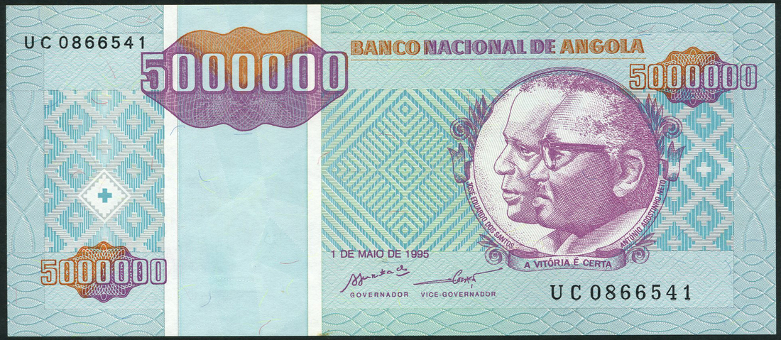 (x) Banco Nacional de Angola, a set of the 1 May 1995 series comprising 1000 kwanzas reajustados, pink, blue and green, 5000 kwanzas reajustados, green, 10000 kwanzas reajustados, red-pink, 50000 kwanzas reajustados, orange-red, 100000 kwanzas reajustados, violet and pale blue, 500000 kwanzas reajustados, brown and pink, 100000 kwanzas reajustados, pink and pale grey-green, 500000 (2) kwanzas reajustados, blue-green and violet, all Antonio Augustinho Neto and Jose Eduardo dos Santos portraits, all Furtado and an unknown signature