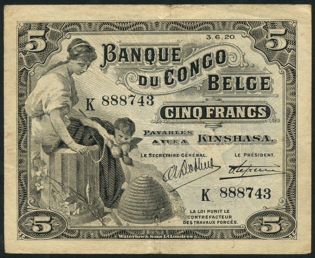 (x) Banque du Congo-Belge, 5 francs, 3 June 1920, serial number K888743, black on pale blue, maiden seated at left with cherub, beehive (Industry) in field, value at right and at each corner, reverse black and pale blue, elephant and hippopotamus at centre