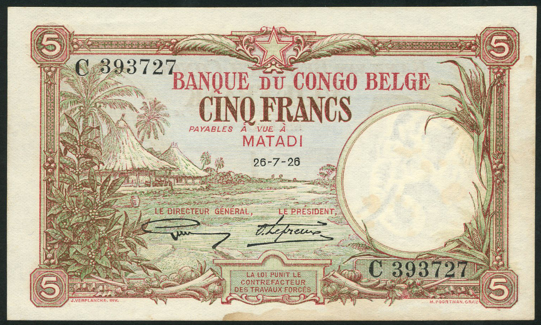 (x) Banque du Congo-Belge, 5 francs, Matadi, 26 July 1926, serial number C393727, pale red, brown and green, huts and palm trees, value top centre and at each corner, reverse steamboat on river at centre