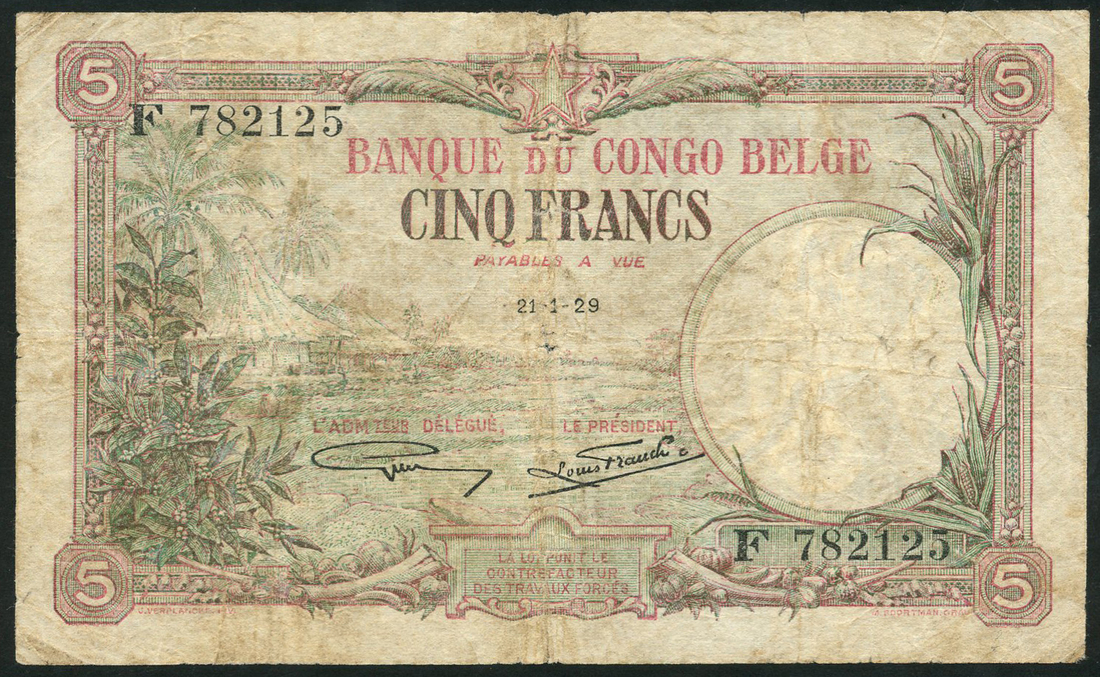 (x) Banque du Congo-Belge, 5 francs, 21 January 1929, serial number F782125, pale red, brown and green, huts and palm trees, value top centre and at each corner, reverse steamboat on river at centre