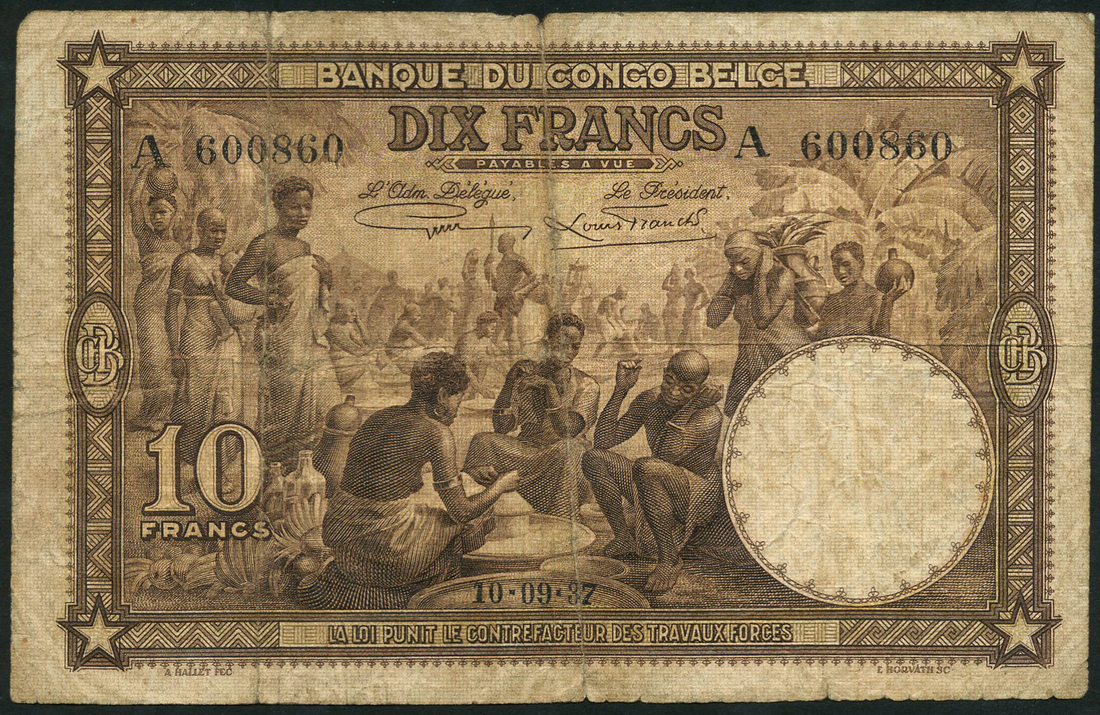 (x) Banque du Congo-Belge, 10 francs, 10 September 1937, serial number A600860, brown and yellow, market scene, value top centre and top left, reverse brown, waterbucks on the savannah