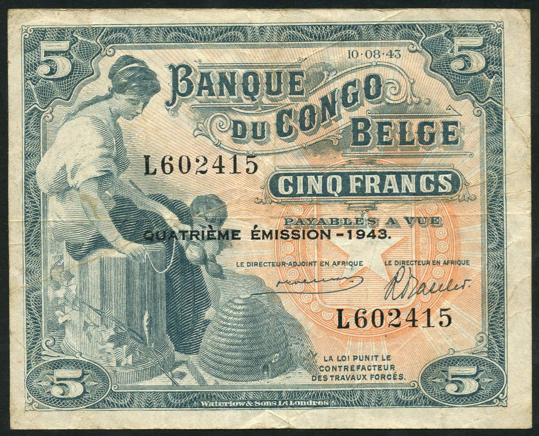 (x) Banque du Congo-Belge, 5 francs, 10 August 1943, serial number L602415, blue-grey and pale orange, maiden seated at left with cherub, beehive (Industry) in field, value at right and at each corner, black overprint 'QUATRIEME EMISSION' in field, reverse black and pale blue, elephant and hippopotamus at centre also another example without emission and with serial number B/C 083151