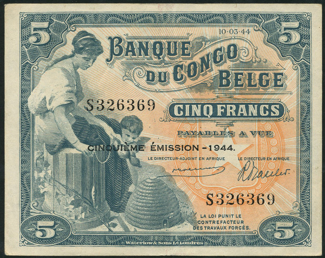 (x) Banque du Congo-Belge, 5 francs, 10 March 1944, serial number S326369, blue-grey and pale orange, maiden seated at left with cherub, beehive (Industry) in field, value at right and at each corner, black overprint 'CINQUIEME EMISSION' in field, reverse black and pale blue, elephant and hippopotamus at centre