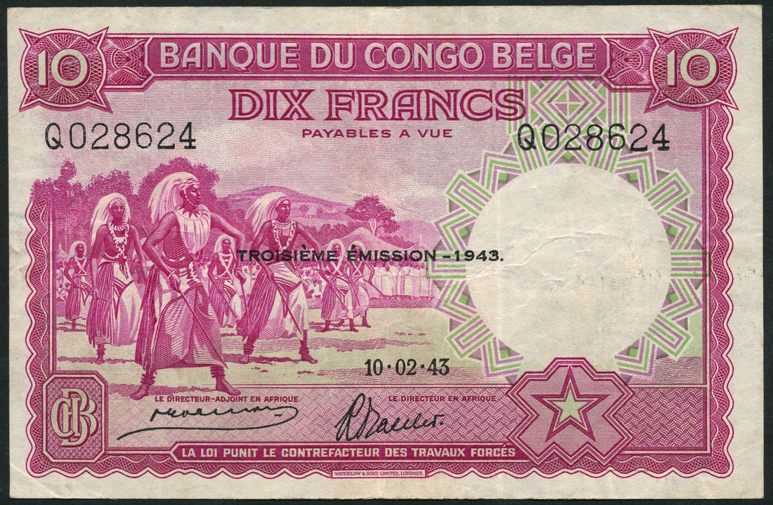 (x) Banque du Congo-Belge, 10 francs, 10 February 1943, serial number Q028624, pink, green and blue, dancing Watusi at centre, 'TROISIEME EMISSION' overprint in field, reverse soldiers on parade ground, also 10 francs, 15 August 1949, serial number A/H645667, as previous but no EMISSION overprint in field