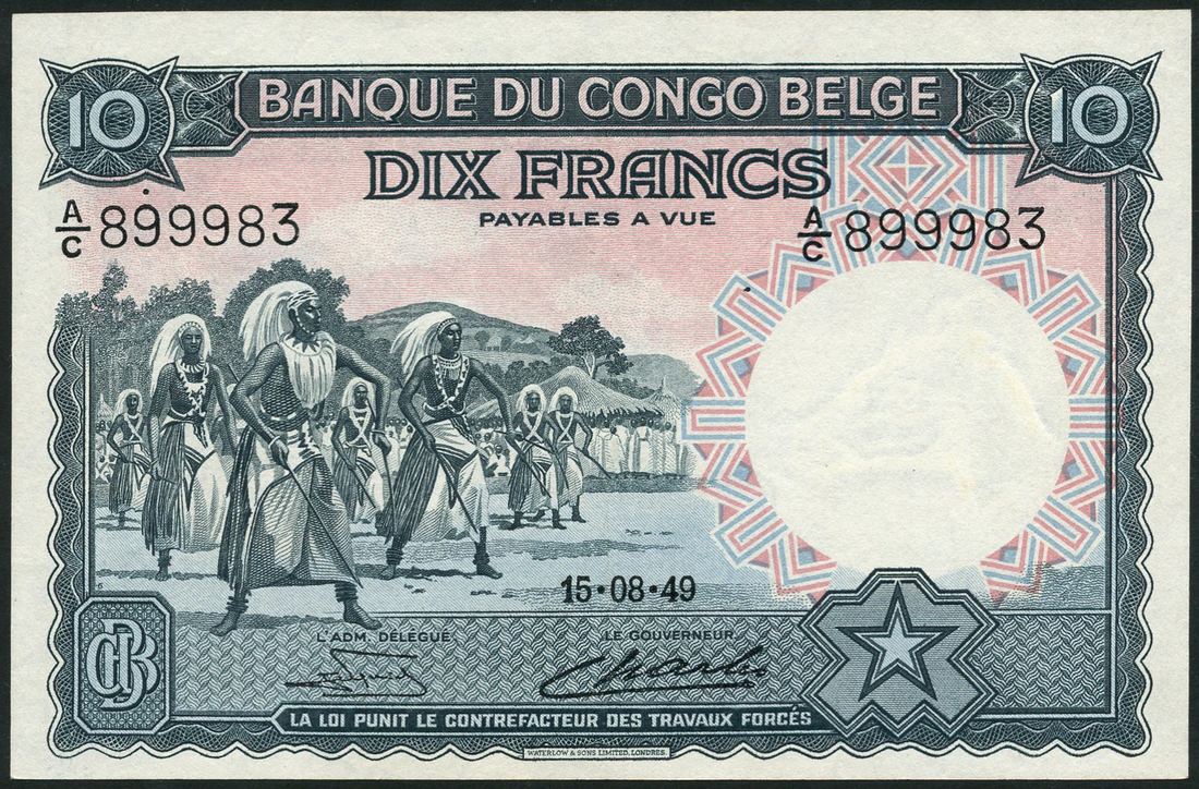 (x) Banque du Congo-Belge, 10 francs, 15 August 1949, serial number A/C899983, green, blue and pink, dancing Watusi at centre, no EMISSION overprint in field, reverse soldiers on parade ground