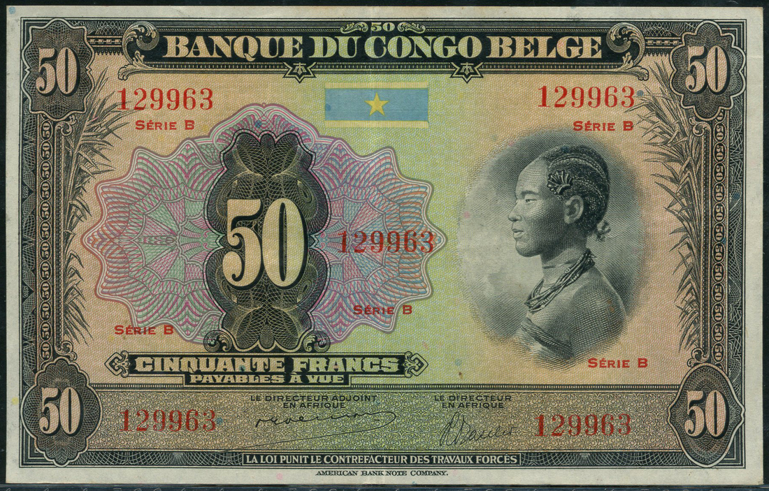 (x) Banque du Congo Belge, 50 francs, ND (1941-1942), serial number 129963, Series B, black and multicoloured, girl at right, value in left field and at each corner, no EMISSION overprint in field, reverse black, leopard at centre, value at left and right