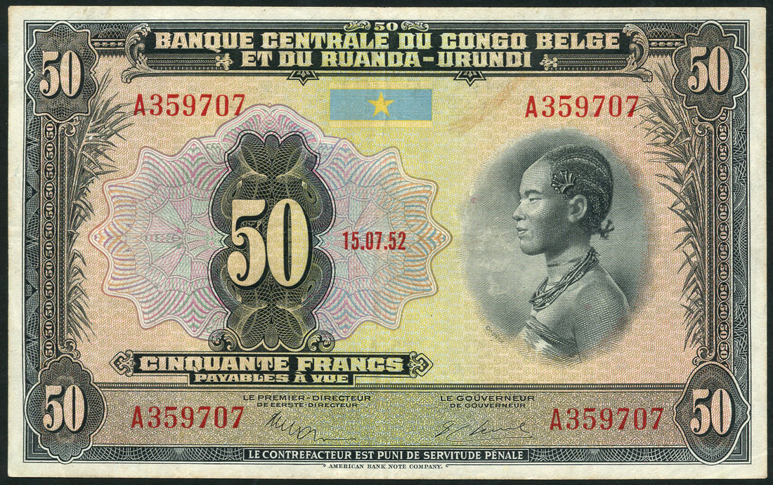(x) Banque Centrale du Congo-Belge et du Ruanda-Urundi, 50 francs, 15 July 1952, serial number A359707, black and multicoloured, girl at right, value in left field and at each corner, reverse black, leopard at centre, value at left and right