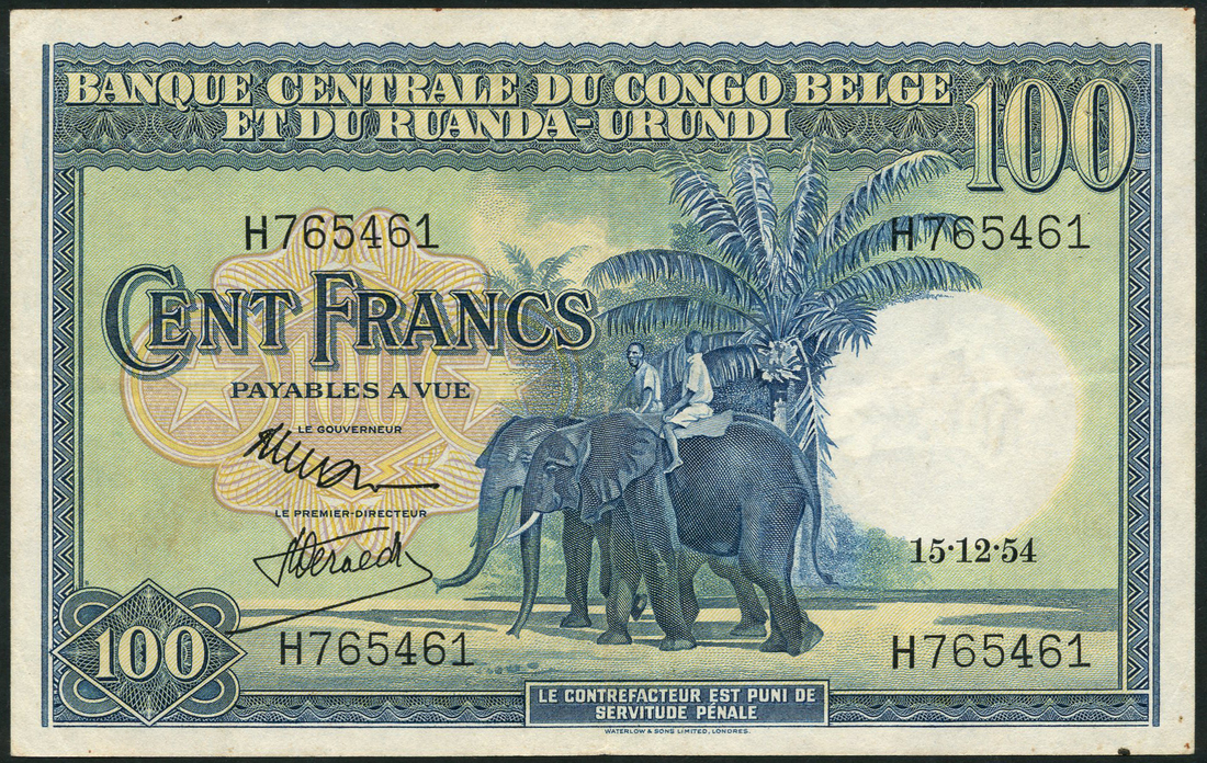 (x) Banque Centrale du Congo-Belge et du Ruanda-Urundi, 100 francs, 15 December 1954, serial number H765461, blue, green and multicoloured, two elephants and palm trees at centre, value at left and at low left and top right, reverse blue, man and oxen