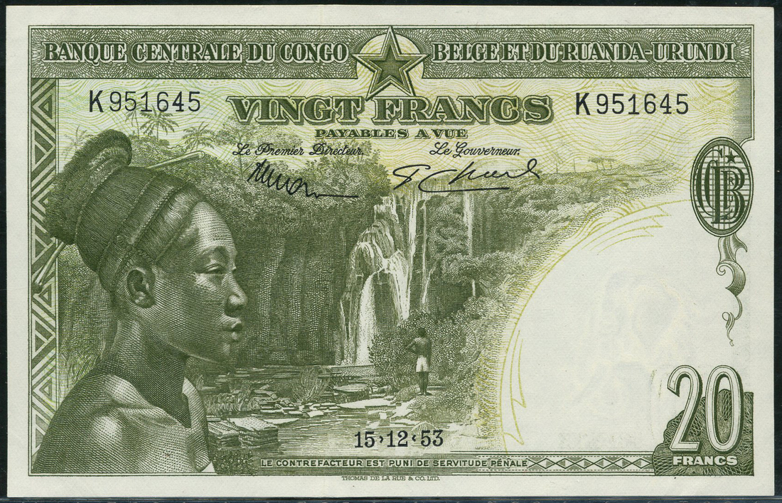(x) Banque Centrale du Congo-Belge et du Ruanda-Urundi, 20 francs, 15 December 1953, serial number K951645, olive and yellow, girl at left, falls at centre, star above, value and bank initials at right, reverse green, the Queen Astrid laboratory in Leopoldville at centre, tribesman with spear at right, value low left