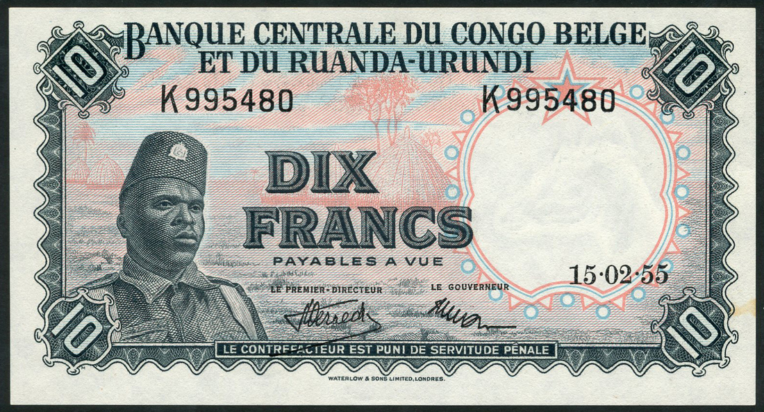 (x) Banque Centrale du Congo-Belge et du Ruanda-Urundi, 10 francs (3), 1955,1957,1958, prefixes K,A/K,B/D, grey-blue and orange, soldier wearing kepi at left, reverse antelope