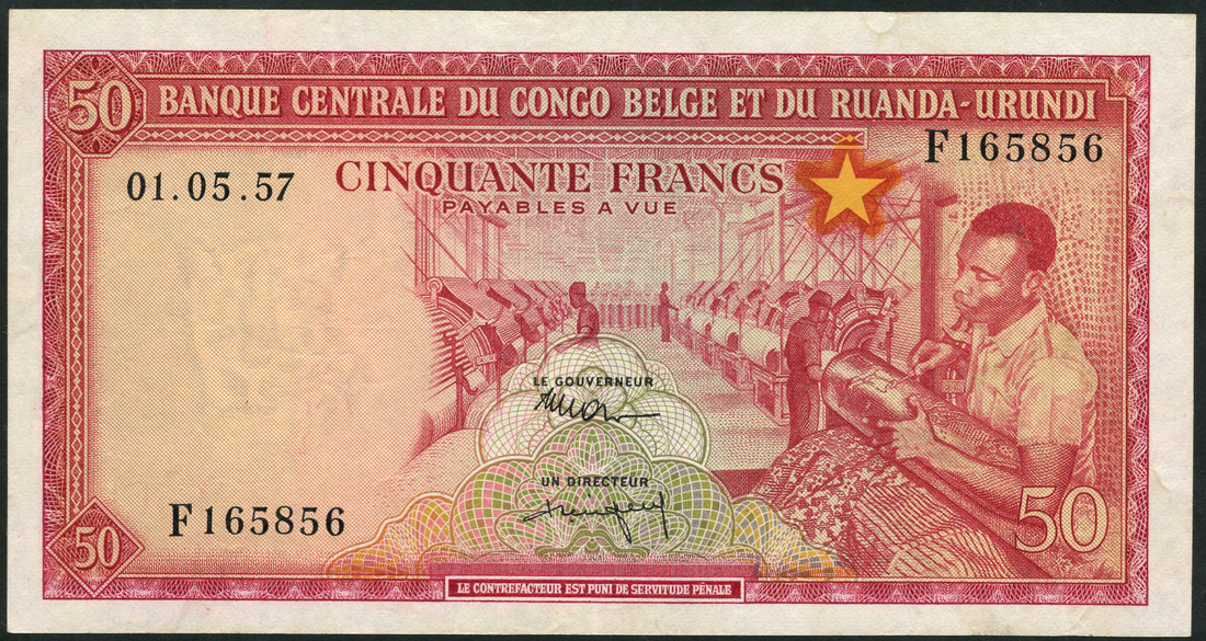 (x) Banque Centrale du Congo-Belge et du Ruanda-Urundi, 50 francs (3), 1957,1959 (2), prefixes F,U,V, red and multicoloured, man at loom at right, star above, reverse huts and weaving
