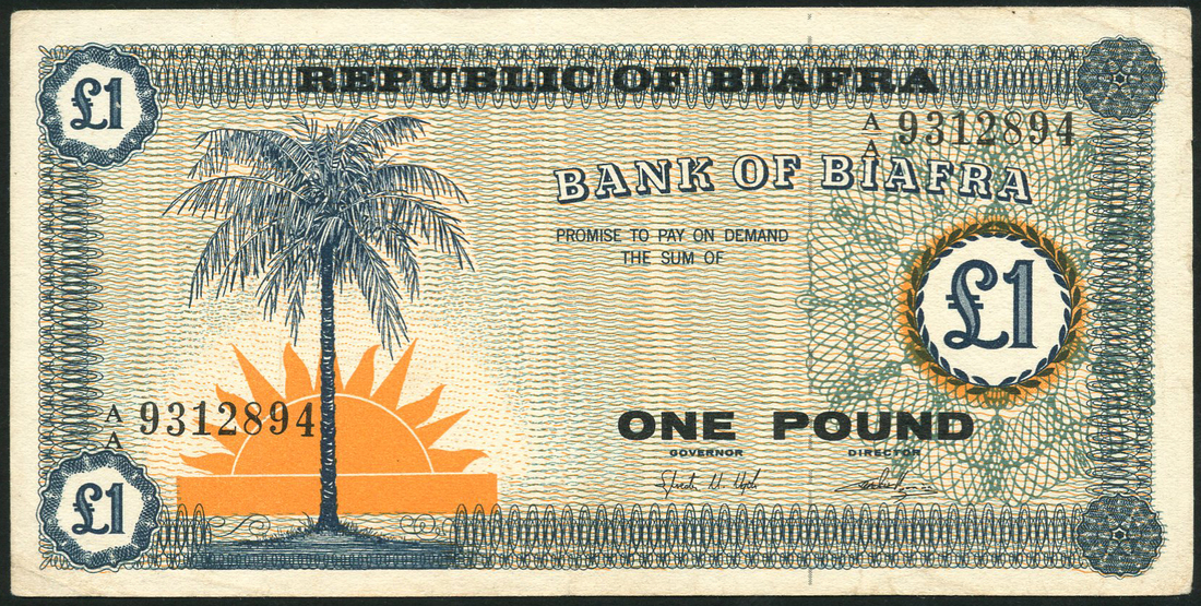 (x) Bank of Biafra, a group comprising 5 Shillings, ND (1967), blue, lilac and orange, palm tree, reverse four Ibo girls; £1, ND (1967), blue and orange, palm tree, reverse arms; also a group of the 1968 (ND) Issues, all palm tree at left or centre, comprising 5 Shillings (3), prefix MF, no serials (2), green and blue; 10 Shillings, prefix GN, pale blue and black; £1 (2), prefix DQ, no serials, brown and green; £5 (2), prefix WD with WASTE NOTE overprint in blue, no serials; £10 (2), prefix ZA, no serials