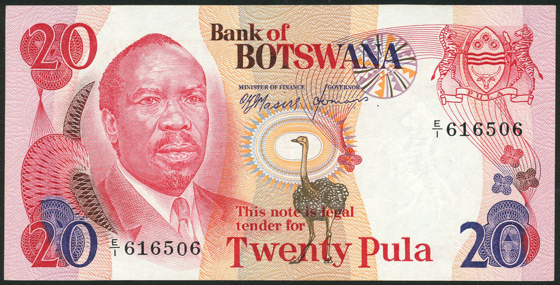 (x) Bank of Botswana, 1,2,5,10 and 20 pula, ND (introduced 1976, the 20 pula 1978), prefixes A/1,B/1,C/1,D/3,E/1, brown, blue, purple, green and red respectively and all with portrait of Seretse Khama at left, arms top right, all Masire and Hermans signatures