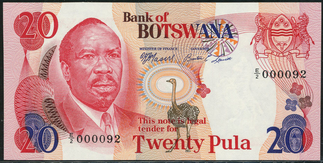 (x) Bank of Botswana, 20 pula, ND (1978), serial number E/2 000092, red and multicoloured, Seretse Khama at left, arms top right, Masire and Leavitt signatures, reverse green, the National Assembly building in Gabarone at centre
