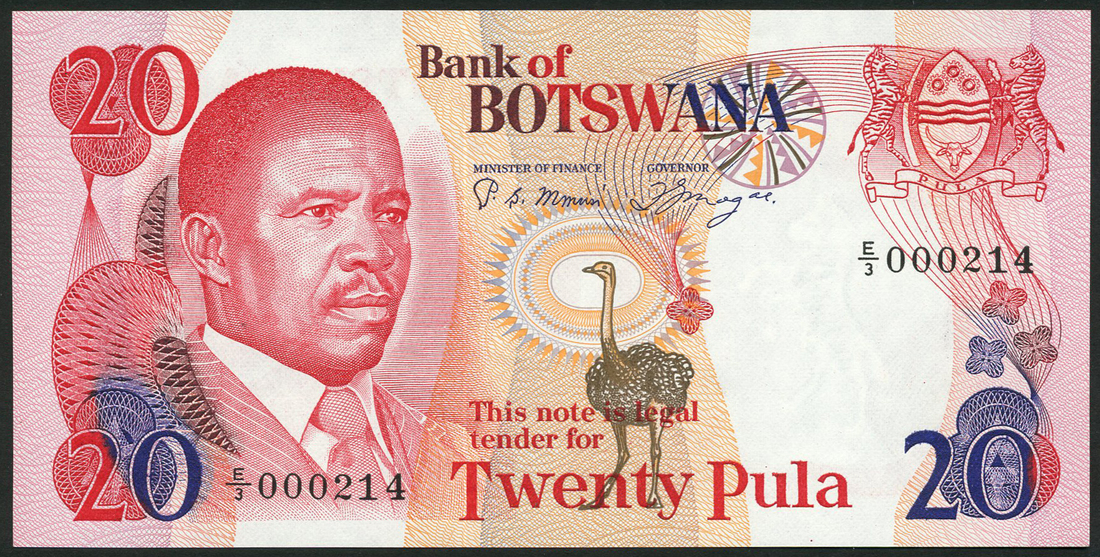 (x) Bank of Botswana, 1 pula, brown, 2 pula (4), blue, 5 pula (3), purple, 10 pula (4), green, 20 pula (4), red, all ND (1982-), all portrait of Quett Ketumile Joni Masire at left, arms top right, Masire and Leavitt signatures, the signatures of Mmusi-Mogae, Mmusi-Kikonyogo, Mmusi-Hermans and Mogae-Hermans are represented