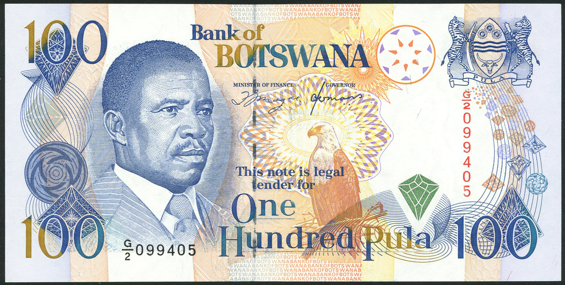 (x) Bank of Botswana, a group of the ND (1990-1995) series comprising 5 pula, purple, 10 pula, green, 20 pula, red, 50 pula (2), brown, 100 pula, blue, all portrait of Quett Ketumile Joni Masire at left, all signatures of Mogae and Hermans