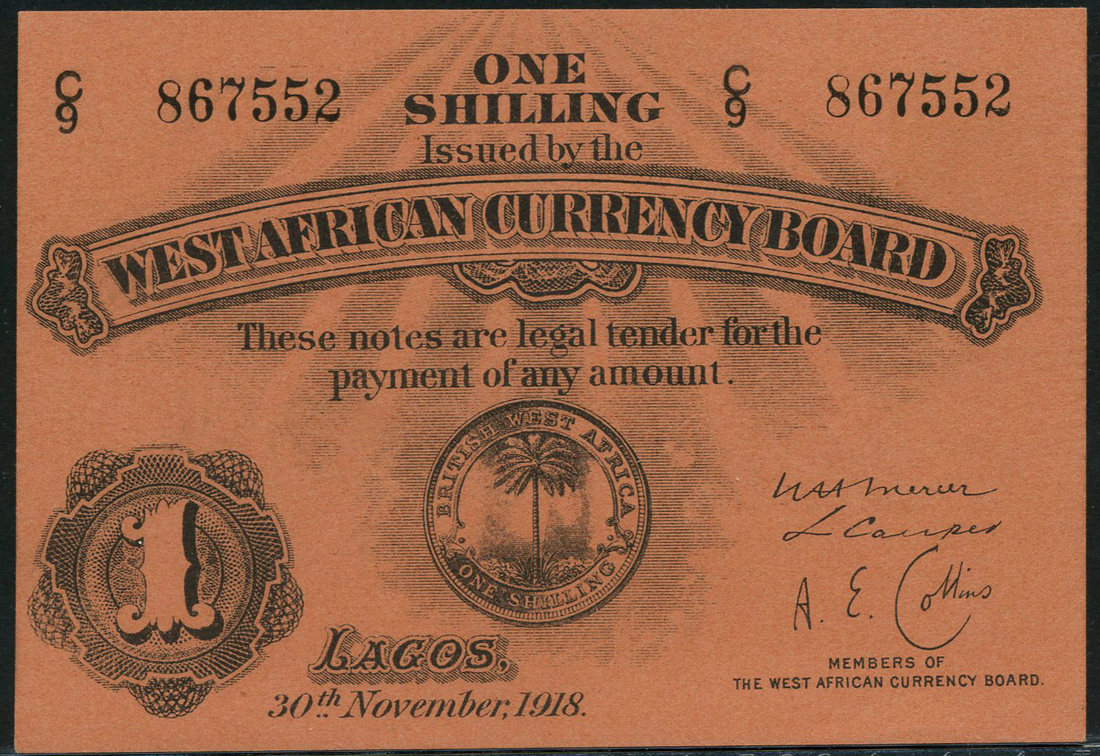 (x) West African Currency Board, 1 shilling, 30 November 1918, serial number C/9 867552, black text on orange paper, 1 shilling coin with palm tree design low centre, value low left, Mercer, Couper and Collins signatures low right
