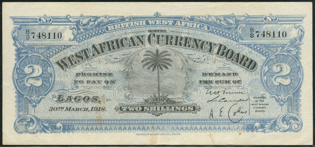 (x) West African Currency board, 2 shillings, 30 March 1918, serial number B/8 748110, black text on pale blue, palm tree at centre, value at left and right, signatures of Mercer, Couper and Collins signatures low right